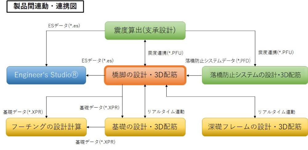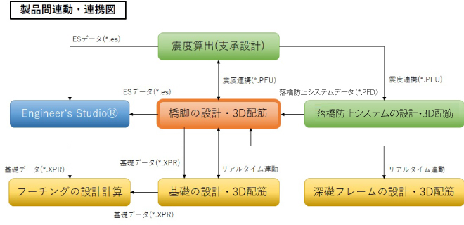 橋脚の設計計算から、図面作成までを一貫して行うプログラムです。鉄筋コンクリート橋脚の耐震性の判定を行います。図面作成では、一般図から配筋図、組立図、加工図、鉄筋表などの図面を一括生成し、DXF、SXF、IFCなどの各ファイル出力に対応しており、Engineer's Studio®データファイル出力にも対応しています。