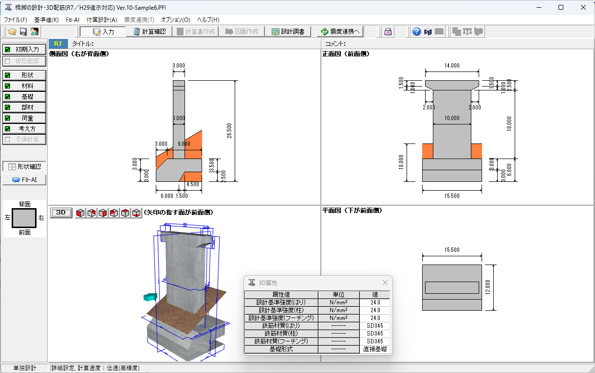 部分係数設計法による単柱式 RC 橋脚の設計計算、図面作成プログラム。公益社団法人日本道路協会より発刊されている道路橋示方書・同解説(令和7年10月/平成29年11月)を参考に、はり、柱、フーチング部材の耐荷性能の評価及び耐久性能の評価、直接基礎の安定評価を行うことが可能です。直接基礎以外の基礎形式(杭基礎・深礎基礎・ケーソン基礎等)については、リアルタイム連動・ファイル連携により評価可能です。準拠基準をR7道示/H29道示から選択可能で、H29道示準拠時はストライプHを主鋼材としたREED工法の設計にも対応しています。