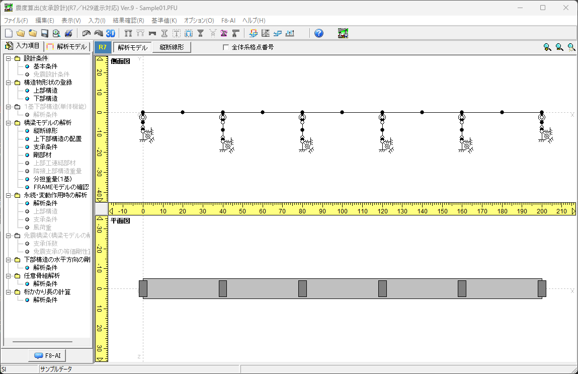 • 橋梁モデル解析:上部構造と下部構造の組み合わせにより、橋梁モデルの解析(固有周期、設計水平震度、分担重量、下部構造に作用する慣性力)に対応