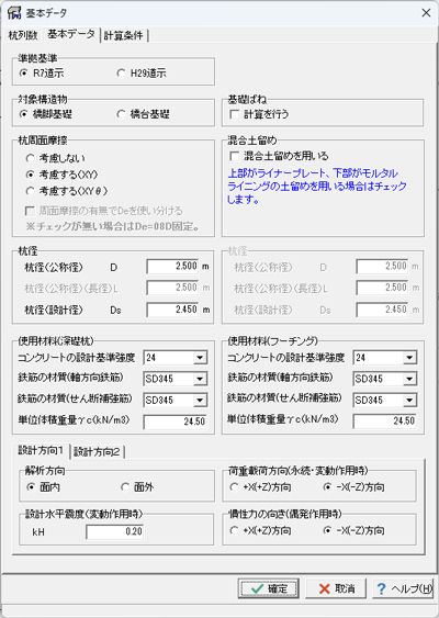 解析方向として面内解析又は面外解析が可能です。杭形状は、円形断面と小判断面に対応しています。