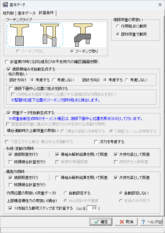 公益社団法人日本道路協会より発刊されている道路橋示方書・同解説(令和7年10月/平成29年11月)を参考に、基礎の安定照査、杭本体・フーチング部材の耐荷性能の照査及び耐久性能の照査を行うことが可能です。