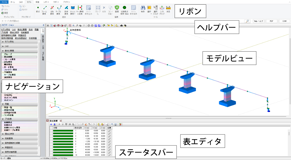 土木・建築構造物の部位を1本棒に見立てた梁要素や平面的な広がりを持つ平板要素でモデル化し、外力に抵抗しながら変形する挙動を解析するツールです。