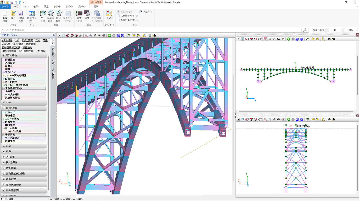 また、板要素を使用したFEMモデルも作成可能で、部材は線形要素から非線形要素まで、荷重も静的荷重から動的荷重まで対応可能となります。
