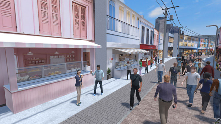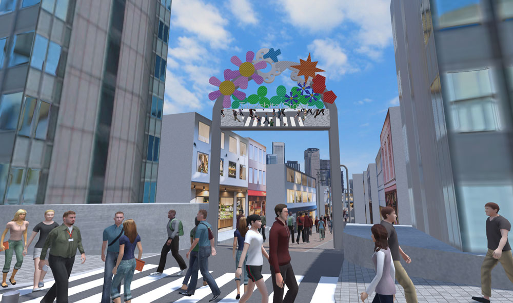 今回の制作では、竹下通りと神田明神を再現しました。竹下通りのゲートに設置された街頭モニターはバーチャルディスプレイで表現し、竹下通りの歩行者は