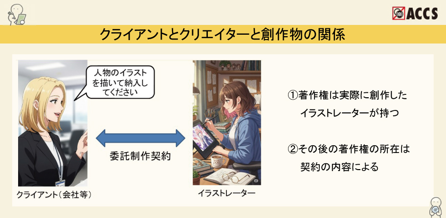 著作権の基本として、イラストの著作権は、そのイラストを創作した人や会社に与えられます。したがって、たとえお金を支払ってイラストを発注したとしても、制作者が著作者として著作権を保有したままであり、自由に利用することはできません。