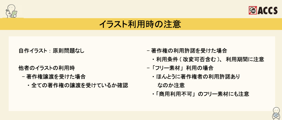 企業や団体が、商品や活動を紹介する印刷物やウェブサイトを制作する際、イラストは外部のデザイン会社やイラストレーター(以下「制作者」と記します)に依頼することが多いでしょう。その際、制作されたイラストの著作権について、十分に意識されているでしょうか。今回は、イラストの制作依頼から利用までにおける、著作権上の注意点を解説いたします。