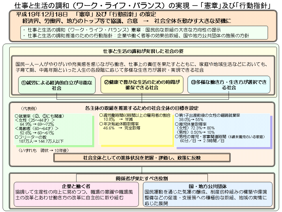 仕事(Work)と生活(Life)の調和を図り、どちらかに偏らない生き方を目指すのがワークライフバランスです。厚生労働省が推進する「仕事と生活の調和(ワーク・ライフ・バランス)憲章」を図1に示しています。