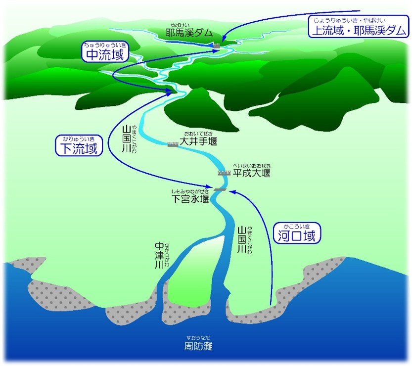 山国川は、福岡県と大分県の県境にある英彦山の麓に源流を発し、しばらく南へ流れた後、山国町藤野木付近で反転して北へ向かい、そのまま周防灘に注ぐ一級河川です。幹川流路延長は56km、流域面積は540km2です。
