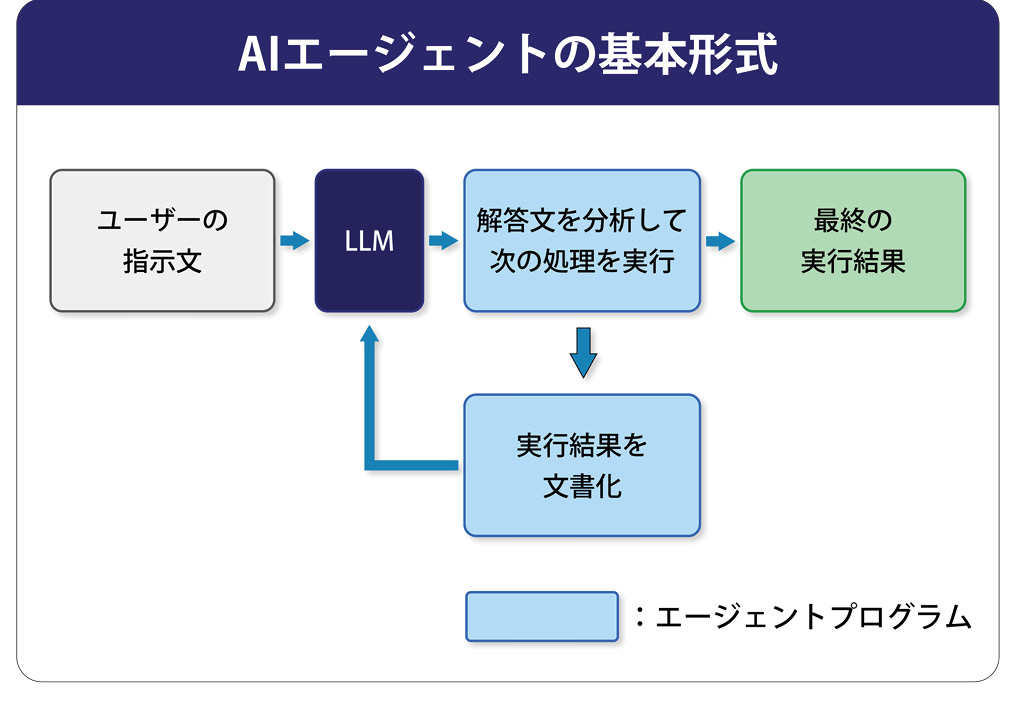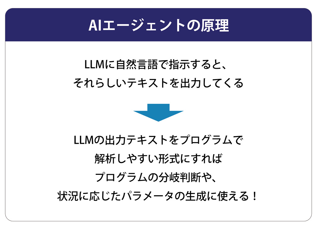 生成AIを使って、どういう仕組みで自然文での命令を実行させることができるのでしょうか? 生成AIのエンジンであるLLM(大規模言語モデル)にできることは、自然文を受け取って、その文に最もふさわしい解答を生成するだけです。 入力も出力も自然文のみで、外部に対して何かを実行する機能はありません。 これを用いて、何かの処理を実行するには、LLMの外側にプログラムを作って、そのプログラムが処理を実行する必要があります。