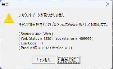 製品起動時に「ライセンスがありません」または「アカウントデータが見つかりません」のメッセージが表示される場合、認証設定ができていない可能性があります。この場合は認証の設定を行う必要があります。上記画面でキャンセルを押し、認証設定を行って下さい。