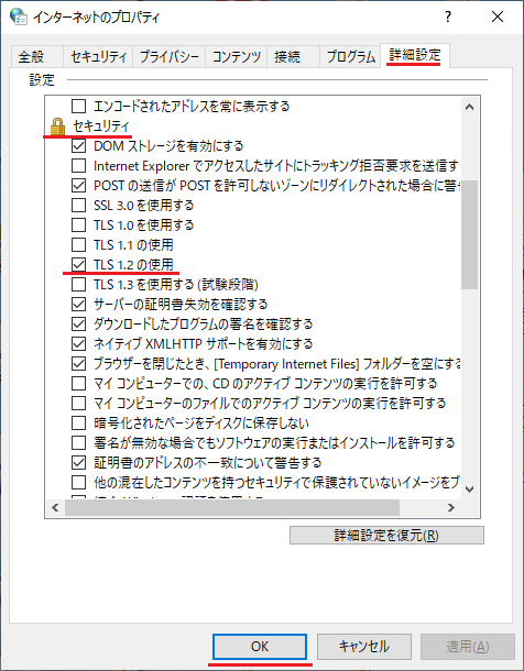 2)[詳細設定]のタブに [TLS 1.2の使用]の項目にチェックをつけます。
