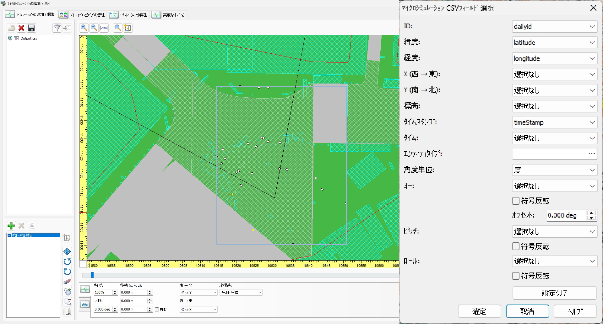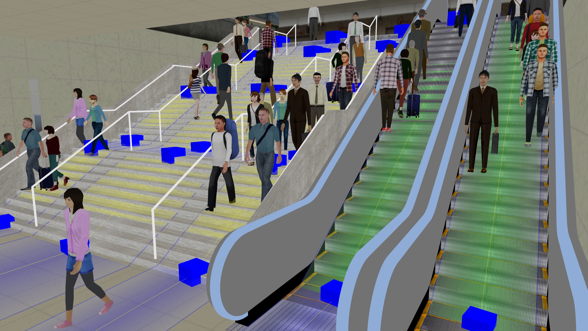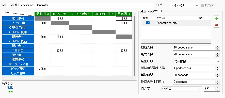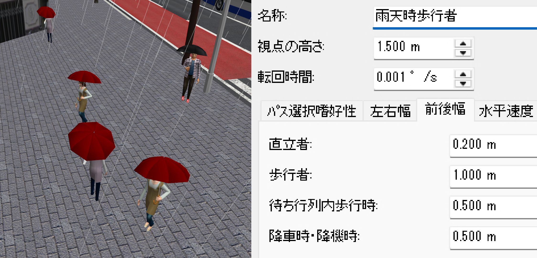 近年は、様々な方法で収集した人の移動の情報をビッグデータとして活用し、人流シミュレーションを行う事例が増えています。今回は、UC-win/Roadで人流シミュレーションを行う方法について解説します。 OD情報のみ存在する場合の人流シミュレーション 人の移動のOD情報(出発地点と目的地の情報)のみが存在する場合、歩行者ネットワークの機能を利用して出発地、目的地、移動人数を入力することで人流シミュレーションを行うことができます。人流の詳細な位置情報が存在する場合の方法は後述します。 歩行者ネットワークの作成 歩行者ネットワークは、幅を持たせた歩行ルート(パスウェイ)を空間上に引き、多数の歩行者を生成する機能です。歩道や広場などに面的にパスを引くことで人流をシミュレーションでき、ランダムな方向もしくはOD設定により目的地へ向かわせる動きを表現できます。作成するにはメニューバーの「編集」⇒「ネットワーク」⇒歩行者の項目で「新規追加」⇒ネットワークの項目で「新規追加」⇒パスウェイの項目で「新規追加」-「パスウェイ」の順に選択し、空間上にパスを引きます。 パスの端部にあたるノードには異なる複数のパスを接続し、広範囲の複雑な歩行者ネットワークを構築できます。パスの途中部分に接続したい場合は、途中の頂点をノードに変換することで接続が可能となります。パスを引いた後は、歩道や広場に合わせてパスの幅を調整します。混雑時は衝突を回避するために歩行者がパスからはみ出す場合もあるため、パスの幅は通行可能な幅よりも若干狭く設定してください。途中で道幅が変わる場合や障害物がある場合はパスを細かく分割し、場所ごとに幅を変えると良いです。 パスは進行方向を設定でき、片方向のみとすることも可能です。例えば左側通行の流れとしたい場合は、2本のパスを並べてそれぞれ逆方向の指定とすることで再現できます。また、フィルターを設定すると、事前に設定した属性の人だけが特定のパスを通らないようになります。 目的地の設定(OD設定) 新規作成した歩行者ネットワークは初期状態では歩行者がランダムに移動しますが、OD設定を行うことで特定の目的地に向かって移動する人流を生成することができます。出発/目的地はそれぞれネットワーク上のノード(「歩行者の発生・消滅」にチェックが入っているもの)を指定するので、ノードに個別の名称を入力しておくと便利です。OD設定への切り替えは「歩行者の生成」の画面でタイプをNormalからODマトリックスに変更します。 ODマトリックスでは指定可能な2点のノードを指定し、2点間を移動する人数の初期値、最大値、単位時間ごとの発生人数等を指定できます。目的地へのルートは最短経路が基本となりますが、混雑状況やエスカレータ等の利用の嗜好性によって変化する場合もあります。 歩行者属性設定 パス上を歩く歩行者は、キャラクタの種類ごとにカテゴリの区分を行うことで、移動速度などの特性やルート選択の嗜好性などを表現できます。カテゴリごとに、階段・エスカレータ・エレベータの選択嗜好性、一人あたりの専有面積、平面/階段/エスカレータの歩行時速度、エスカレータの歩行割合などの設定が可能で、カテゴリ自体も追加可能です。 この設定を応用すると、例えば雨天時の想定でシミュレーションする場合に、専有面積を広めに設定して移動速度を遅くすることで、歩行者が傘をさしている場合の人流を表現できます。その際、歩行者プロファイルで傘をさしているキャラクタを選び、描画オプションで雨を降らせると、よりリアルな見た目となります。 階段/エスカレータ/エレベータ設定 人流を再現するルート上に階段やエスカレータがある場合、まず階段やエスカレータに沿ってパスを引きます。その後、タイプの設定を階段もしくはエスカレータに切り替えることで、歩行者の挙動がそれぞれに適したものとなります。階段の場合は移動速度を落とすことができ、エスカレータの場合は立ち止まったまま指定の速度で移動するほか、立って乗る人と歩く人の割合を指定して表現できます。 エレベータの場合は、3Dモデルと連動させて表現します。ドアの開閉を表現した3Dモデルを配置し、ノードのスケジュール設定でモデルの割り当てと開閉コマンドの指定を行うと、エレベータで接続された2つのノード間の移動が表現されます。ドア周辺にはノードの待ち行列機能で行列の並び位置を引くことでエレベータ待ちの行列が再現されます。 移動経路の座標情報が存在する場合の人流シミュレーション 各個人の移動経路が座標情報として記録されている人流データがある場合は、CSVに書き出すことでマイクロシミュレーションの機能で人の動きを再現可能です。その場合、歩行者ネットワークの構築は必要ありません。 ■人流の読み込みに必要な要素設定 人流データの中に以下の要素が揃っている必要があります。その際、時間情報や位置情報は個人I