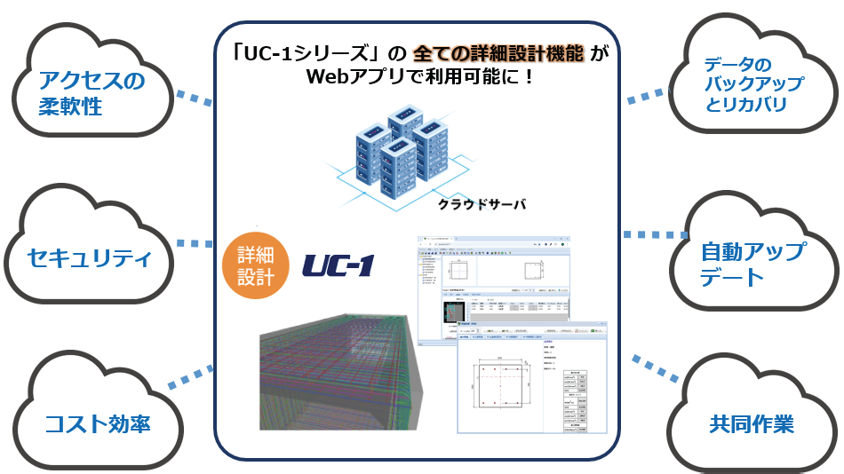 「UC-1 Cloud Completeシリーズ」では、Windows版の「UC-1シリーズ」で提供してきた詳細設計機能をクラウドベースのWebアプリとして順次展開しています。クラウド版では、「UC-1シリーズ」の高精度かつ柔軟な設計・解析機能と、インターネット接続があれば場所を問わずリアルタイムに利用できる利便性を融合しています。