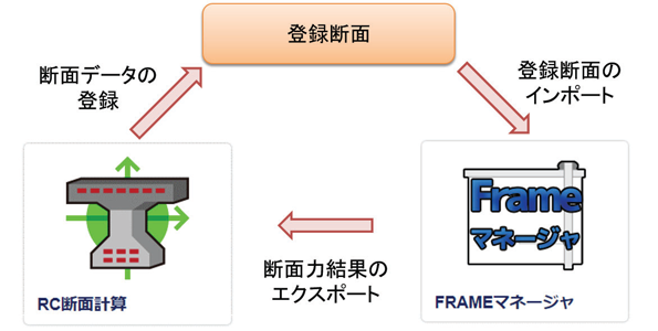 「UC-1 Cloud RC断面計算(旧基準) Complete」とのファイル連携にも対応しています。RC断面計算で作成した断面データをFRAMEマネージャで使用する登録断面機能、FRAMEマネージャで算出した断面力をRC断面計算用にエクスポートするRC連動機能をサポートしています。これにより、構造解析から断面照査までの一連の検討をクラウド上で行うことが可能です。