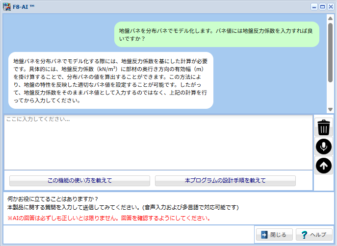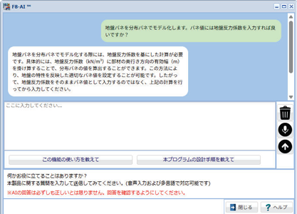 本製品では、UC-1シリーズで展開している「F8-AI™ UCサポート」に対応します。本機能は、入力操作に関する疑問や計算理論の確認など、これまでサポート窓口へお問い合わせいただいていた内容を、AI によって製品内で解決できるようにするものです。多言語および音声入力にも対応しており、設計作業の効率化を実現します。