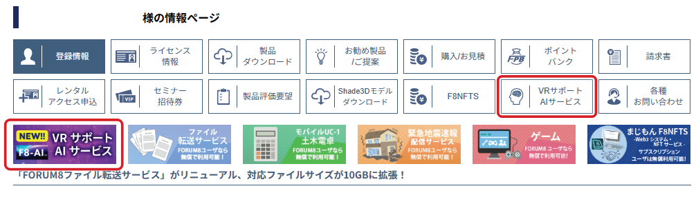 ユーザ情報ページからログイン後のメニューより、使用可能です。赤枠で囲ったバナーまたはボタンにより、AI問合せフォームが開きます。