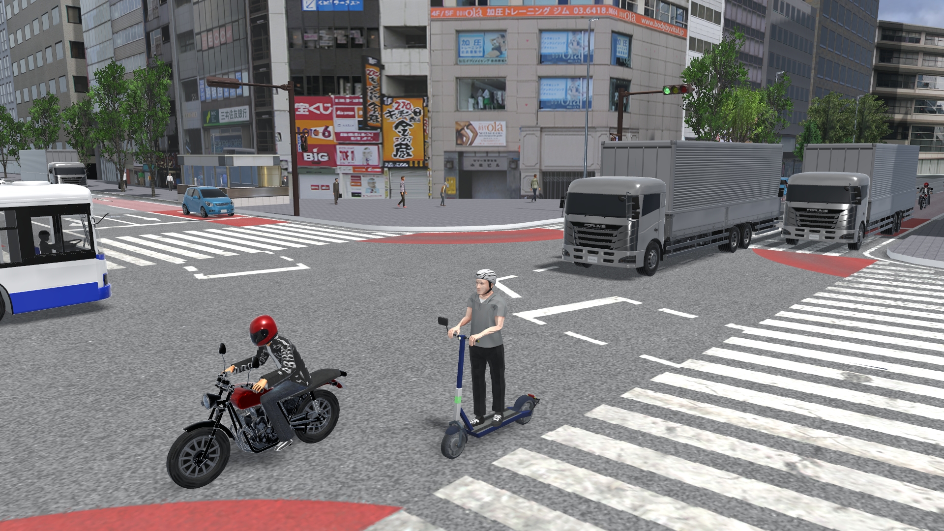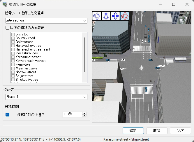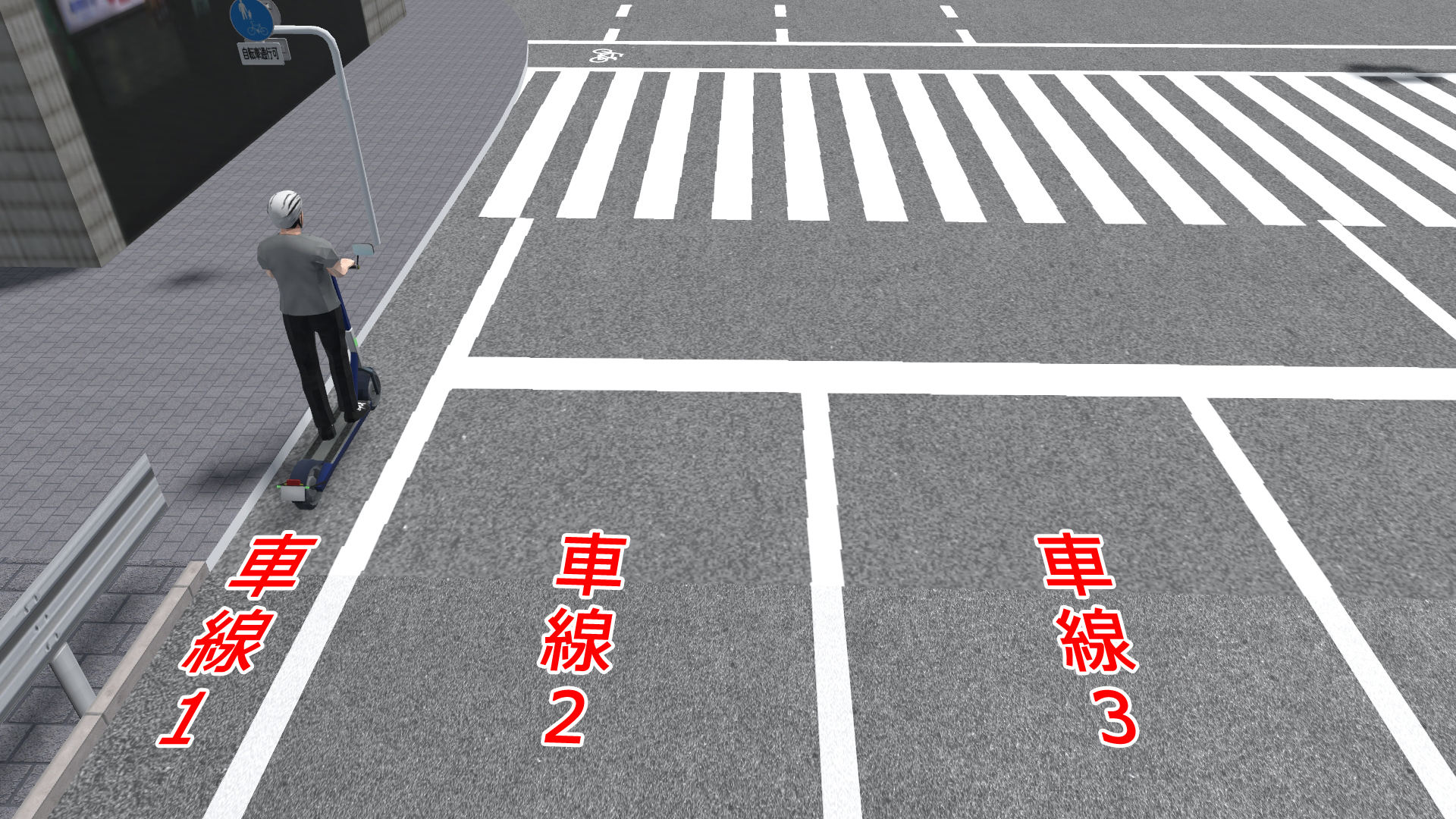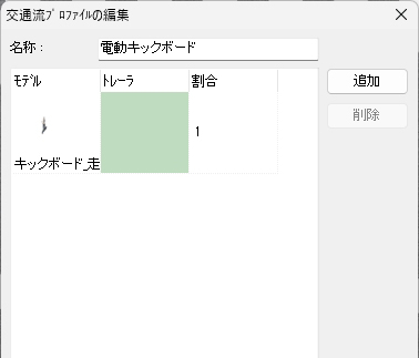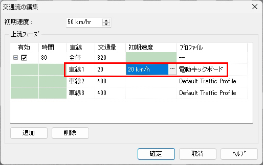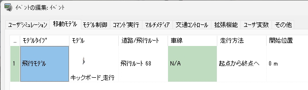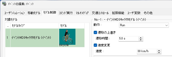 2026年4月1日から自転車の交通違反に対して交通反則通告制度(青切符)が導入されるなど、近年は自転車利用者に対して交通事故防止の徹底がより強く求められるようになってきています。今回は、シナリオを利用して自転車や電動キックボードの動きをコントロールする方法について紹介します。意図的な制御を行わない単純な走行の表現については Up&Coming150号 のサポートトピックスで紹介しているので、そちらをご覧ください。 シナリオ設定による自転車のコントロール 自転車の走行を表現する最も単純な方法は、MD3キャラクタの設定で飛行ルートを指定する方法ですが、その場合は一定の速度で走行させるか、動作制御点を使用して特定の地点で速度を変える表現のみ可能です。停止させた場合、再度走行開始させることはできません。 シナリオを使用する場合は、上記の方法では行えない以下の表現が可能となります。 任意のタイミングでの速度の変更 シナリオを使用する場合、イベントのモデル制御設定を使用して任意のタイミングでの速度の変更が可能です。タイミングはイベント遷移条件により指定可能で、時間、衝突判定、距離、キーボード操作等の様々な条件を選択できます。また、速度の変更と同時に動作(アクション)の切り替えも可能で、デフォルト設定では一瞬で切り替わりますが時間を指定して徐々に切り替えていくことも可能です。なお、イベントで制御可能なキャラクタは同一シナリオ内で設定したものに限ります。 一時停止と発進の動作の指定 シナリオを使用せずに自転車のキャラクタの速度をコントロールする場合は動作制御点を使用しますが、特定の地点における速度を指定する形となるため、一度停止させてしまうと発進させることはできません。 シナリオを使用する場合はイベント遷移条件を指定して速度をコントロールするため、イベントのモデル制御で 0km/hを指定して停止させた後に、任意のタイミングで再び速度を指定することで発進させることが可能となります。これにより、交差点での一時停止の表現や、自動車が近づいたタイミングで自転車を発進させるヒヤリハットの再現をシナリオ設定で行うことができます。 信号に従って停止・発進する様子を表現する 標準機能ではMD3キャラクタを信号に従って動作させることはできませんが、シナリオで信号現示の切り替えタイミングとMD3キャラクタの停止・発進タイミングを同時にコントロールすることで、自転車が信号に従って動くイメージを疑似的に表現することが可能となります。それぞれ以下の方法でイベント設定を行います。 (1)シナリオイベントによる信号現示のコントロール (2)自転車の停止と発進のコントロール この方法で自転車をコントロールすることで、単純に信号に合わせて直進する自転車だけでなく、交差点で二段階右折を行う自転車の再現にも応用することができます。 シナリオ設定による電動キックボードの表現 自転車の走行はMD3キャラクタを使用しますが、電動キックボードの走行を表現する場合は自動車と同様に3Dモデルを使用します。RoadDBからダウンロードする場合、3Dモデルの「道路車両」内の「自転車・バイク」のカテゴリに登録されています。 飛行ルート上を走行させる場合 歩道もしくは道路上の任意の場所を走らせたい場合、飛行ルートを引いて電動キックボードの走行設定を行うこととなります。設定の考え方はMD3キャラクタによる自転車の表現と同様で、電動キックボードの場合は「飛行モデル」を指定することでモデルリストから選択でき、速度の設定は自転車の場合と同様となります。 交通流として走行させる場合 例えば路肩を走る電動キックボードが信号に従って赤信号で停止、青信号で発進する様子を表現する場合、交通流として表現することで自動車から車両として認識され、衝突せずに走行させることができます。その場合、道路断面を工夫して路肩部分を車線として設定し、交差点や交通流設定で自動車が路肩の車線を走行しないよう設定する必要があります。 道路断面を編集して路肩を車線として設定した後、電動キックボードを走らせるための交通流設定を行います。まずは交通流プロファイルの設定で、電動キックボードのみが含まれるプロファイルを新規作成します。 次に、電動キックボードを走らせる道路の交通流設定で、路肩として設定した「車線1」のプロファイルを電動キックボードのものに設定し、同じ行の初期速度の欄をクリックして電動キックボードの走行速度を指定します。その他の車線は空欄のままとします(空欄の場合は上の欄外の初期速度で指定されている値が適用されます)。その後、交差点の走行ルートや停止位置の調整を行うことで、路肩を走る電動キックボードを表現することができます。 シナリオによる自転車・電動キックボード表現の活用イメージ こうしたVRシミュレーションに触れることにより、普段キックボードや自転車