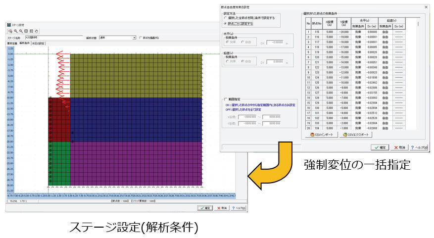 複数の節点に対して強制変位を一括設定できる機能を追加しました。強制変位は境界条件(節点自由度拘束)として設定しますが、選択した複数の節点に対してそれぞれ異なる強制変位や固定条件(水平固定、鉛直固定)を一括で設定することができます。CSVデータのインポートも可能です。本機能により、例えば図3のように、土留め壁に別途算出した壁体変位を強制変位として与える場合など効率的な設定をすることができます。