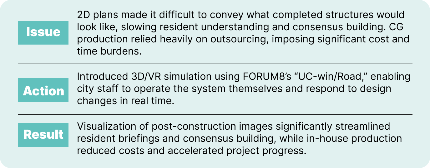 Mayor Kosaka recalls that when he first saw the VR content created in UC-win/Road, he initially wondered how costly it must have been. In reality, however, overall burdens in terms of both cost and time have decreased compared to when work was frequently outsourced and revised externally. Moreover, being able to respond instantly within the simulation to comments such as “Wouldn’t it be better if we adjusted this part?” has dramatically enhanced opportunities for dialogue. “Like a digital twin, we can test ideas virtually before applying them on-site. VR allows us to redo things again and again — before we enter the real world where time, effort, and money are much harder to spend,” the Mayor says.